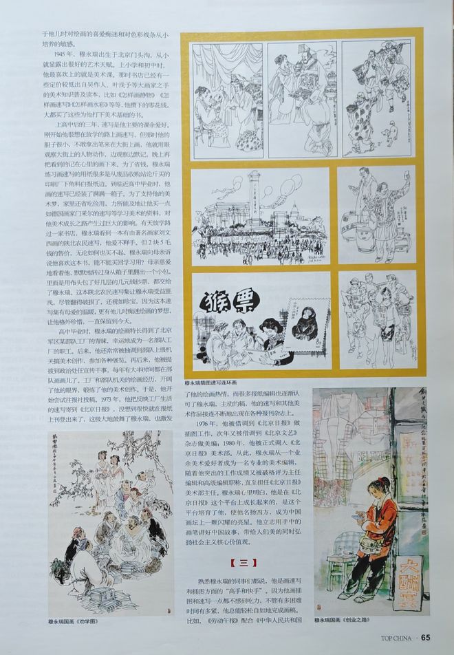 在长期的艺术生涯中,穆永瑞还画过大量的连环画,插图和速写,曾多次出版并获奖。这些作品具有很高的艺术价值,同时对穆永瑞的人物国画创作产生了重要影响。穆永瑞将在速写中练就的简练流畅而准确的线条,扎实的造型能力,精准捕捉人物情态特征的能力,以及在连环画,插图中培养的高度的组织提炼能力,灵活多变的构图能力等等统统融入国画创作之中。避免了人物国画常犯的千人一面,僵硬呆滞,苍白无力之弊,使人物神形兼备,性格丰满,画面鲜活生动,情趣盎然,仿佛每个画面里都藏着一个故事,越品越有味,越看越过瘾。
